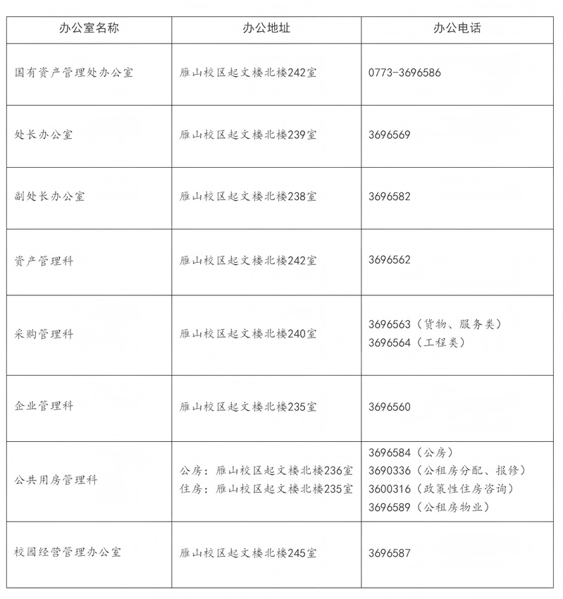 根据工作需要,国有资产管理处办公场所迁至雁山校区起文楼北楼二楼东侧,并于2026年3月1日起正式在新址办公。迁址后,原办公电话号码不变(详见下图)。